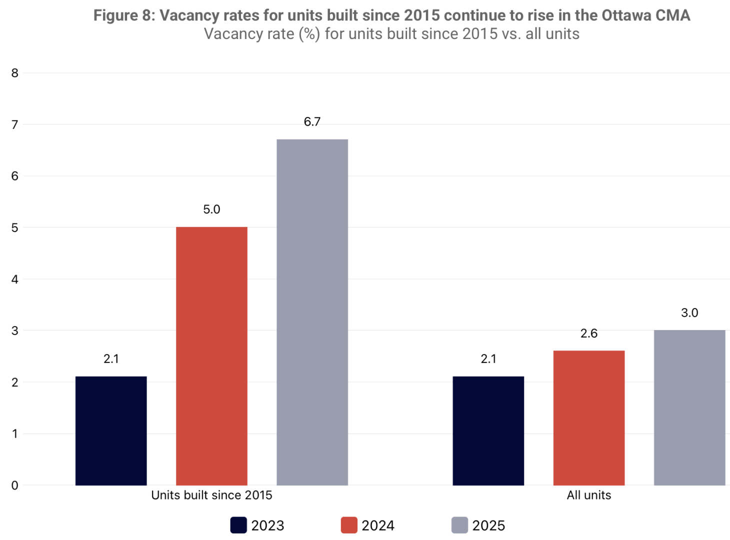 Here in Ottawa, the average vacancy rate for purpose-built rentals was 3.0% and for condominium apartments was 0.6%. Average rents were $1,926 and $2,503 respectively. It seems our purpose-built rental stock is disproportionately expensive.