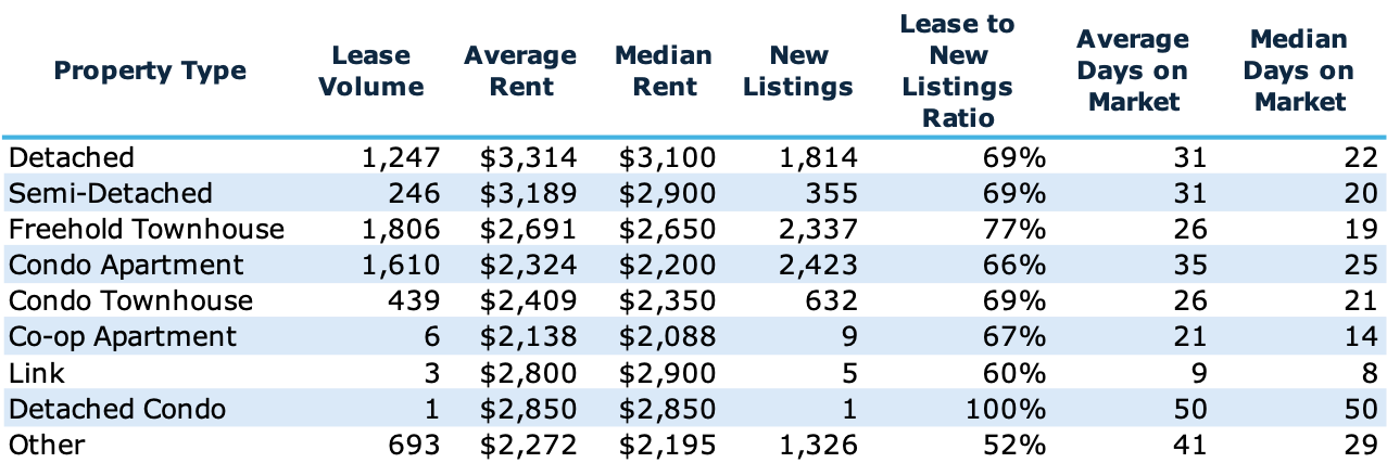 The second table shows the breakdown of rental transactions by property type. This provides detailed insight into the rental market that does not include the massive number of new purpose-built rental apartment towers recently and currently being constructed. CMHC’s vacancy and average rental rate data shared at the top of this article compares only purpose-built rental apartment buildings with condominium units.