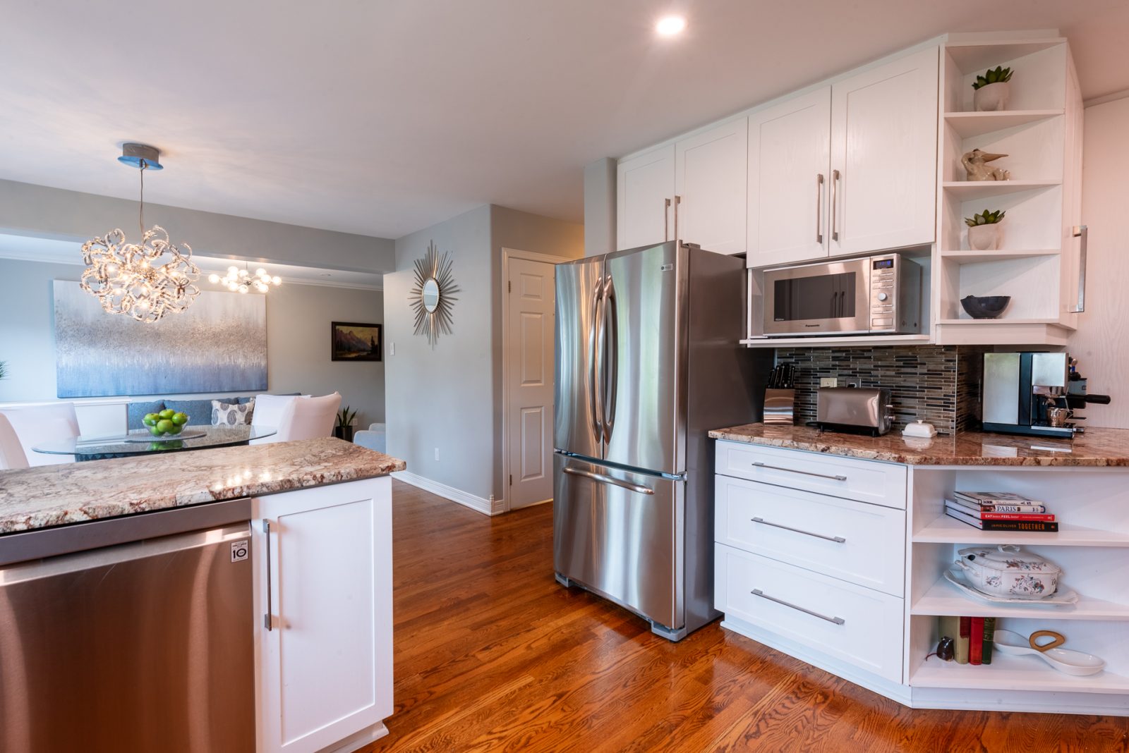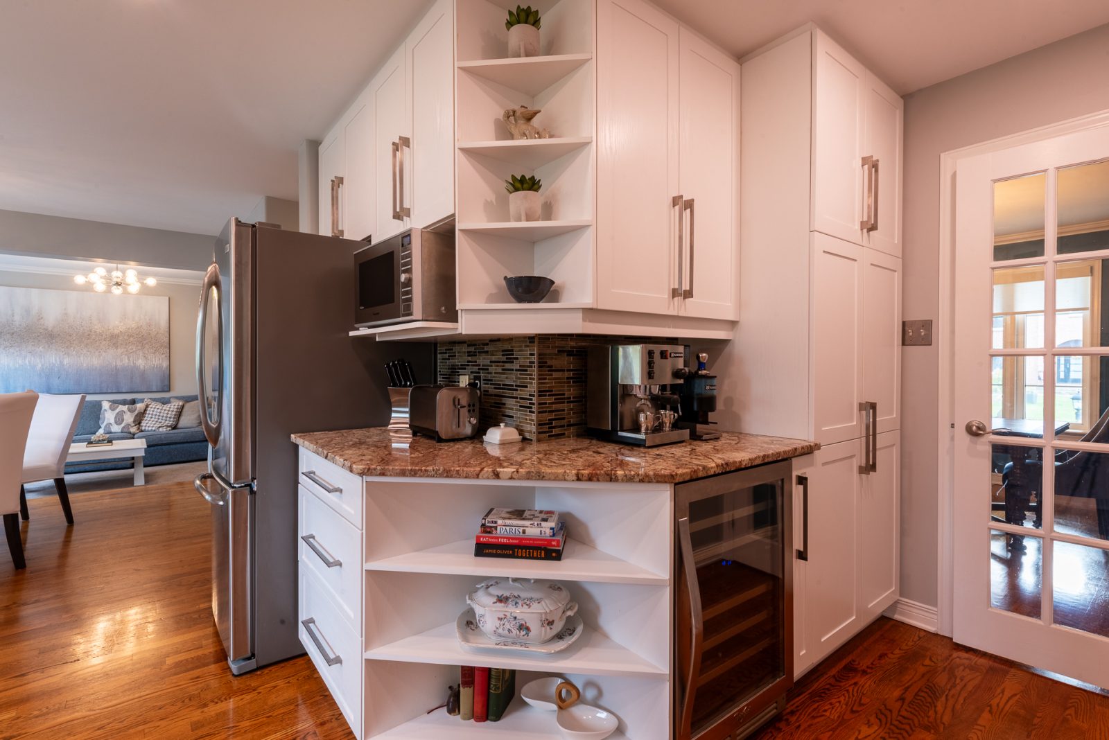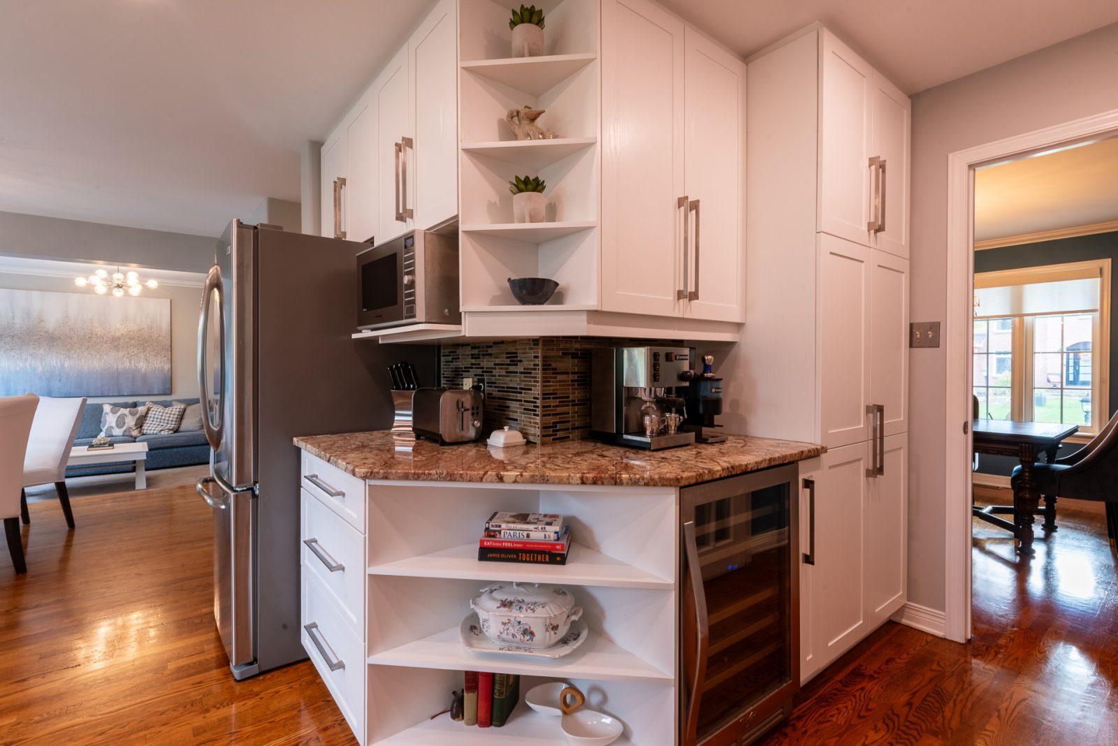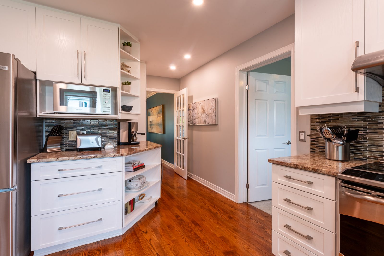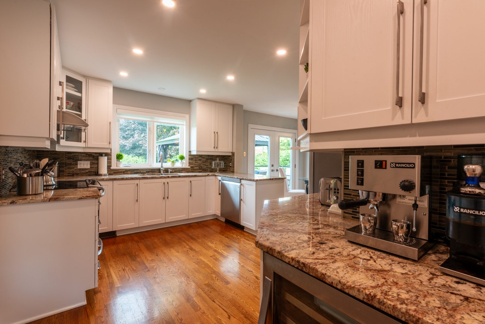 Attention has been paid to those most-important rooms for daily life: three of four bathrooms are fully updated, there are three walk-in showers in total, and an oversized jetted tub as well. The kitchen has been refreshed in classic bright white and features an induction range and highly functional separate coffee station. This home magically offers an up-to-date vibe without sacrificing cozy welcoming warmth.
